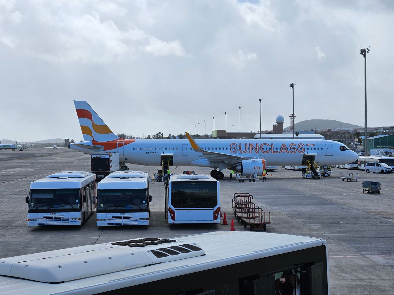 Auf Gran Canaria angekommen ging das Elend dann los. Erstmal standen wir auf einer Außenposition. Das ist lästig, aber kein Beinbruch. Für den ersten Schwung an Passagieren, die über die Treppe ausstiegen, lief es auch ganz gut. Ab in den Bus und weg waren sie. Leider gehörten wir zum zweiten Schwung, und den hatte man wohl offensichtlich nicht bedacht, denn wir standen gut 20 Minuten auf besagter Treppe rum und warteten auf den zweiten Bus. Quasi wie bestellt und nicht abgeholt. Und es regnete. Zwar nicht viel, aber es reichte, um zumindest einen Passagier mit seinem Kleinkind auf dem Arm so ausrasten zu lassen, das ihn einer der Flugbegleiter wieder zurück ins Flugzeug holte.