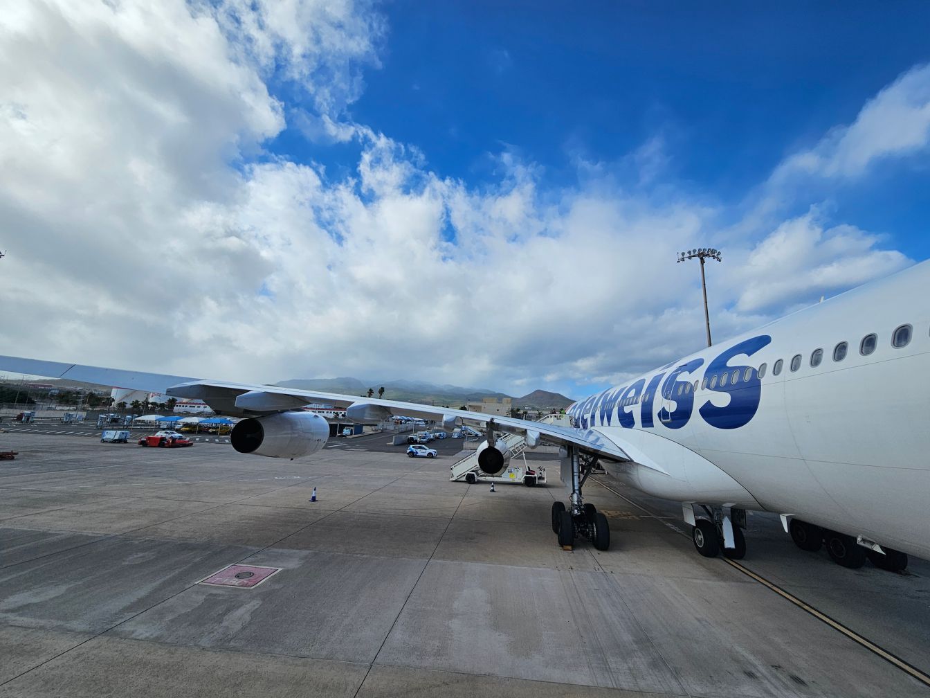 Warum eigentlich der Umweg über Zürich? Erstmal sind wir als fleißige Meilensammler quasi mit der Lufthansa-Gruppe verheiratet, und außerdem fand ich als Hauptverantwortlicher für die Flüge diese Streckenführung am spannendsten. Und damit kommen wir direkt zum zweiten Flug, der nämlich von Edelweiss (die hatten wir noch nicht) mit einer A340 (hatten wir schon häufiger auf Flügen in die USA) durchgeführt wurde. Das ist also eigentlich ein Langstreckenflieger und somit deutlich bequemer als die kleinen Standardflugzeuge, die auf den Strecken zu den Kanaren normalerweise fliegen.